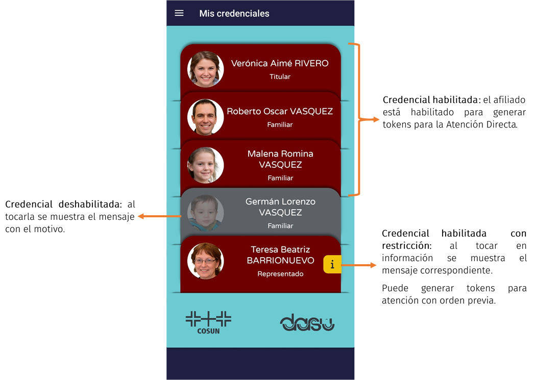 El titular puede ver todas las credenciales de su grupo familiar y de sus representados.