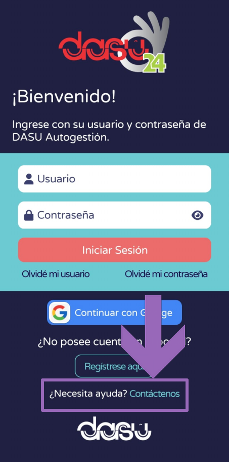 En lugar del usuario puede ingresar su e-mail de registro en DASU Autogestión o utilice la opción dentro de la APP para acceder al formulario de recuperación de usuario o de contraseña.
