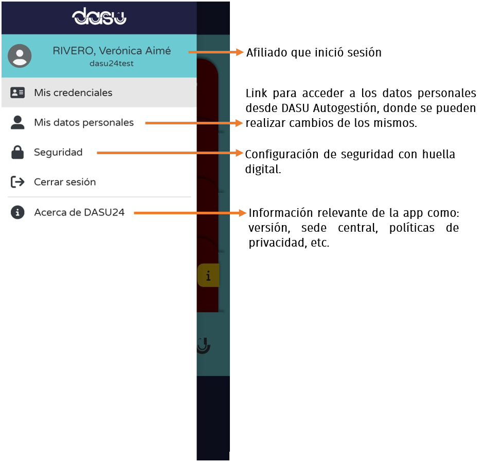 En el menú de la app se encuentran otras funciones e información relevante como “Mis datos personales”, “Cerrar sesión” y “Acerca de DASU24”.