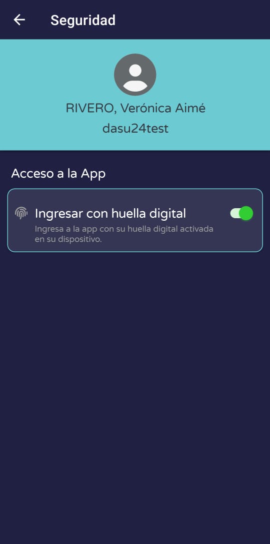 Puede activar el ingreso con huella digital luego de iniciar la sesión respondiendo el mensaje que se muestra de forma automática por única vez o desde el menú Seguridad.